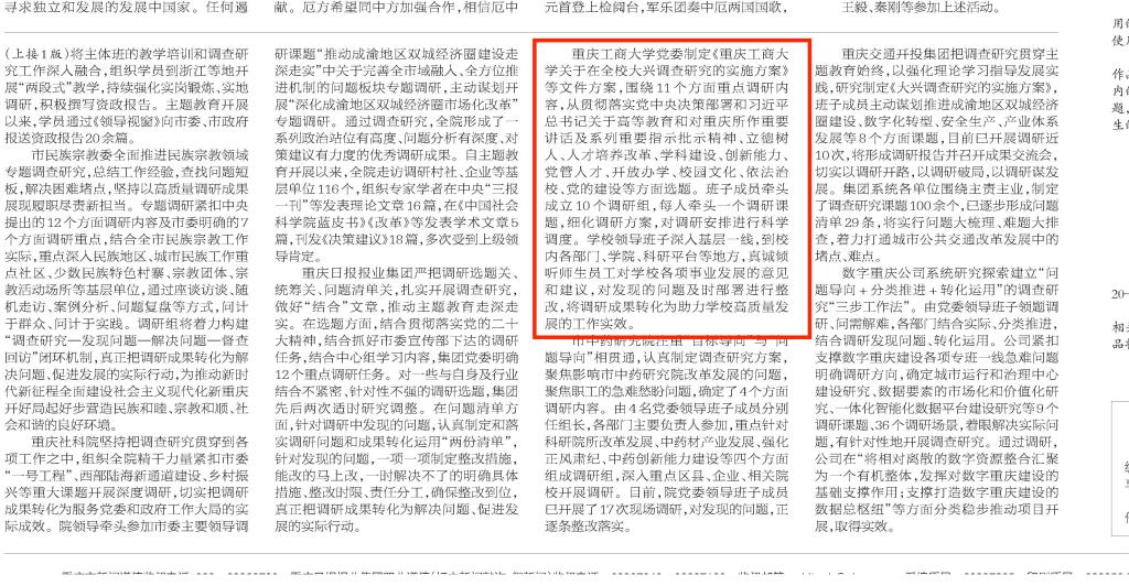 5月16日,重庆日报以《重庆第一批主题教育单位扎实开展调查研究》为题,报道我校扎实开展调查研究。报道中指出,学校党委制定《乐鱼在线登录关于在全校大兴调查研究的实施方案》等文件方案,围绕11个方面重点调研内容,从贯彻落实党中央决策部署和习近平总书记关于高等教育和对重庆所作重要讲话及系列重要指示批示精神、立德树人、人才培养改革、学科建设、创新能力、党管人才、开放办学、校园文化、依法治校、党的建设等方面选题。班子成员牵头成立10个调研组,每人牵头一个调研课题,细化调研方案,对调研安排进行科学调度。学校领导班子深入基层一线,到校内各部门、学院、科研平台等地方,真诚倾听师生员工对学校各项事业发展的意见和建议,对发现的问题及时部署进行整改,将调研成果转化为助力学校高质量发展的工作实效。
