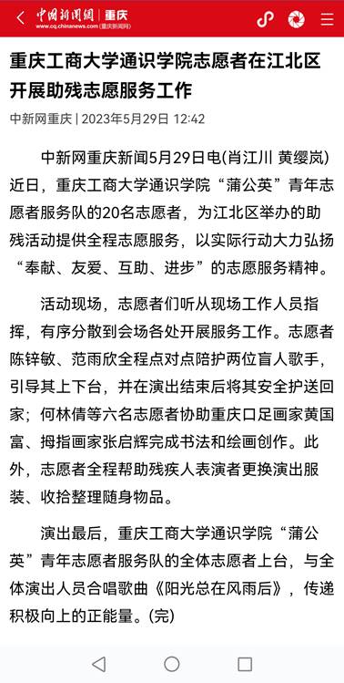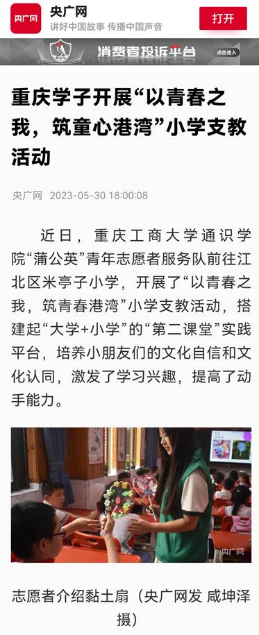 近日,央广网以《重庆学子开展“以青春之我,筑童心港湾”小学支教活动》为题,报道我校通识学院开展小学支教活动;中国新闻网以《乐鱼在线登录通识学院志愿者在江北区开展助残志愿服务工作》为题,报道我校通识学院志愿者参与江北区助残活动。