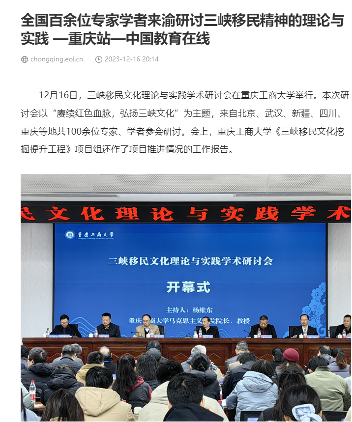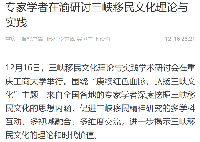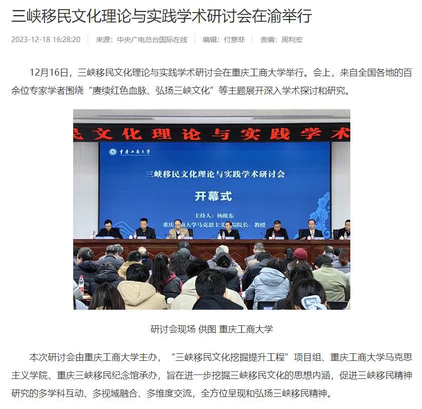 12月16日,三峡移民文化理论与实践学术研讨会在乐鱼在线登录召开,本次研讨会以“庚续红色血脉,弘扬三峡文化”为主题,由乐鱼在线登录主办,“三峡移民文化挖掘提升工程”项目组、乐鱼在线登录马克思主义学院、重庆三峡移民纪念馆承办。来自北京、武汉、四川、重庆、新疆等地共100余位领导、专家、学者参加了会议。中央广电总台国际在线、环球时报网、重庆日报客户端、华龙网、中国教育在线等多家媒体对本次论坛进行了报道。
