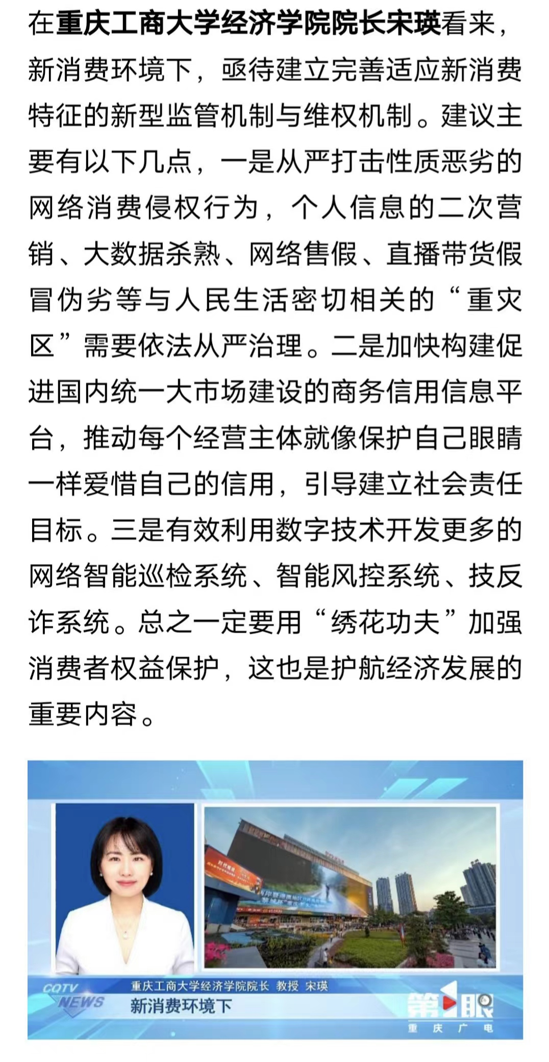 3月15日,重庆卫视《第1眼新闻》报道我校经济学院院长宋瑛教授谈论新消费环境下消费者权益保护问题。她就“高质量的产品服务是高质量发展的重要一步,怎样让315变365,激发消费活力?”针对高质量的产品服务和高质量发展的内在逻辑进行深入分析并提供建议。