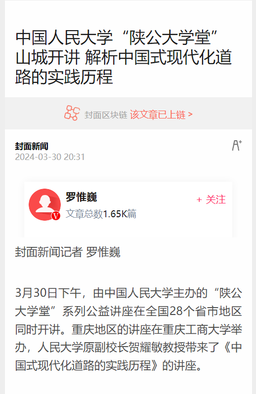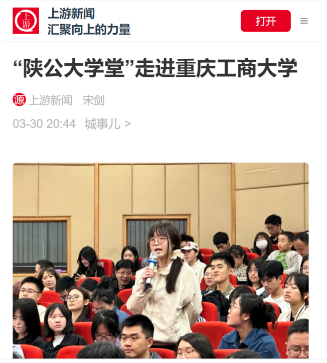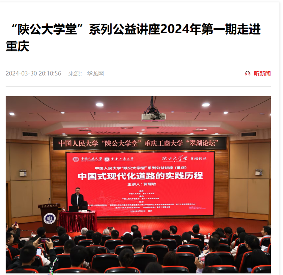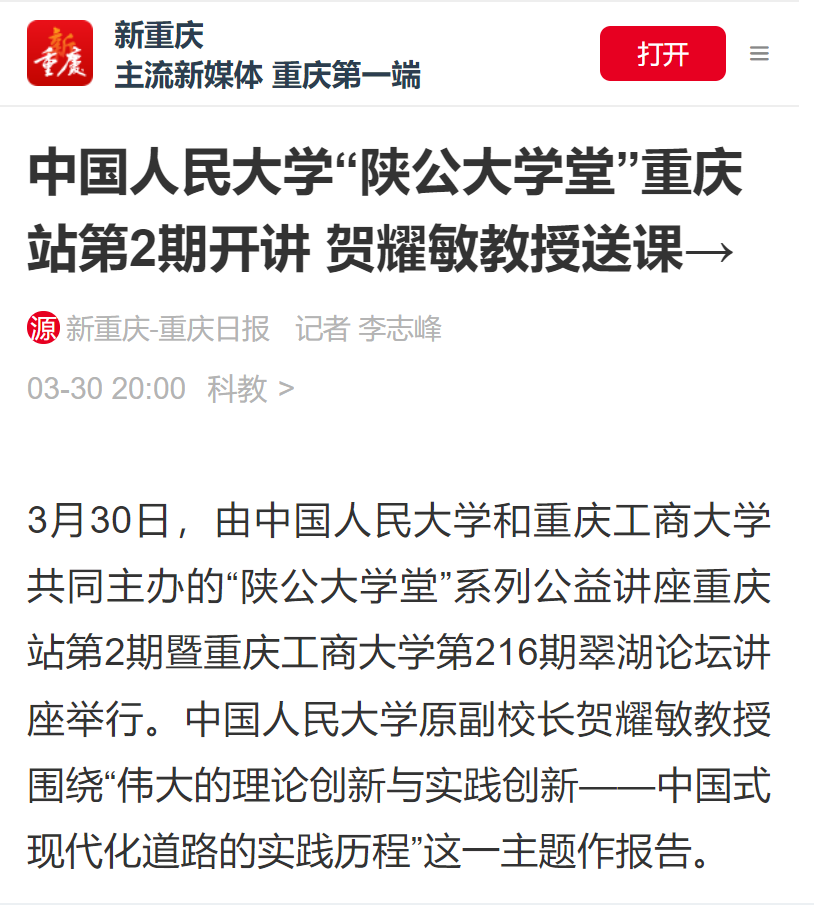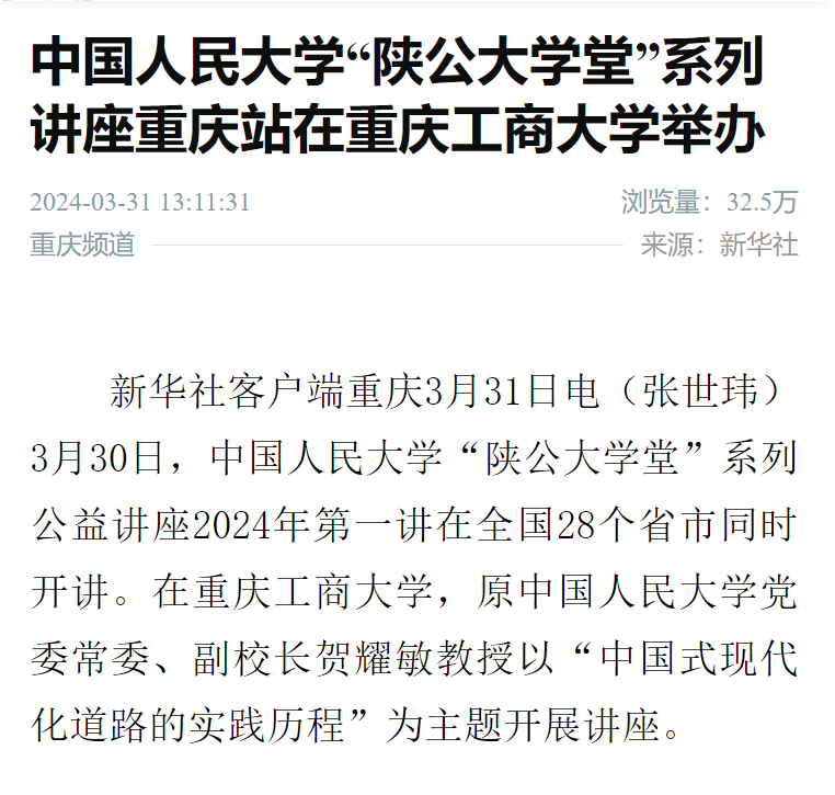 3月30日下午,中国人民大学“陕公大学堂”系列公益讲座走进乐鱼在线登录,在我校博智楼7200报告厅成功举行。中国人民大学原党委常委、副校长贺耀敏教授围绕“伟大的理论创新与实践创新—中国式现代化道路的实践历程”作主题讲座。新华社、重庆日报、重庆新闻联播、华龙网、上游新闻、封面新闻等主流媒体对此进行了报道。