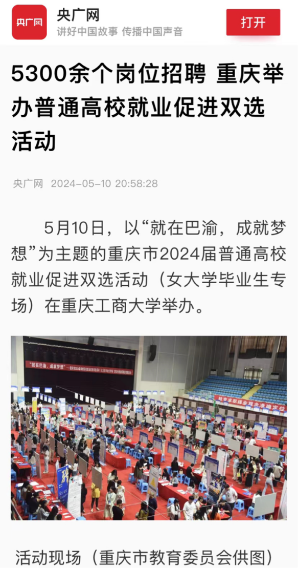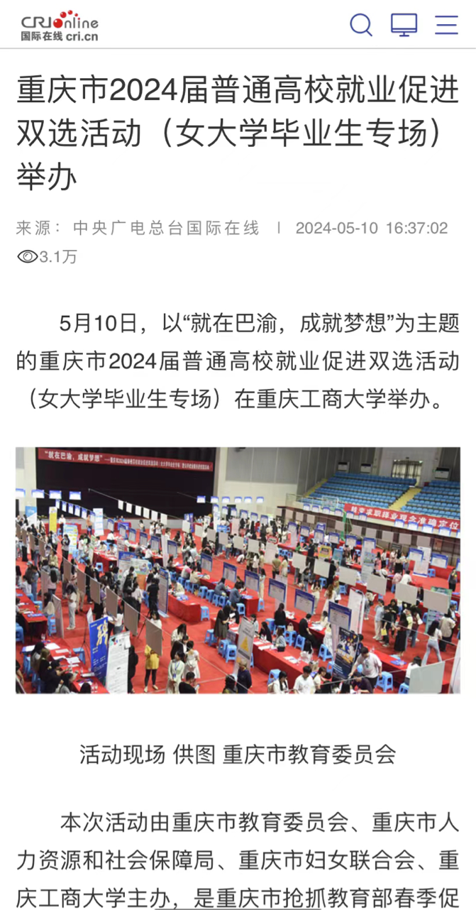 5月10日,央广网、中央广电总台国际在线等主流媒体以“就在巴渝,成就梦想”为主题,报道我校顺利承办重庆市2024届普通高校就业促进双选活动(女大学毕业生专场)。