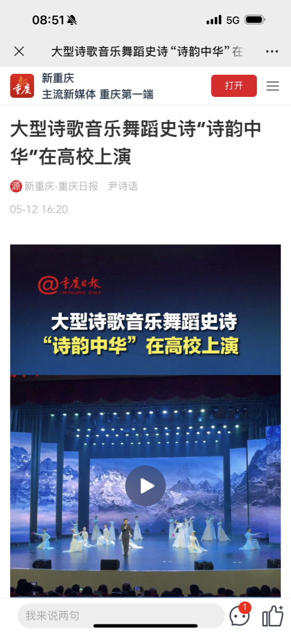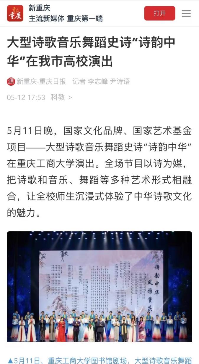 5月11日,新华网、新重庆客户端、华龙网等主流媒体以“高雅艺术走进高校”为主题,报道国家文化品牌、国家艺术基金项目——大型诗歌音乐舞蹈史诗“诗韵中华”在我校顺利演出。