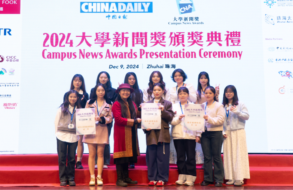 12月9日,由中国日报举办的“2024大学新闻奖”颁奖典礼在北京师范大学-香港浸会大学联合国际学院(珠海)举行,现场颁发了最佳数据新闻、最佳经济新闻报道等28个奖项。其中由红尘教授指导,文学与新闻学院学生采写的新闻作品分别获中文组“最佳文化艺术新闻报道”冠军、“最佳新闻报道”亚军、“最佳新闻采写”季军和“最佳新闻特写”季军四个奖项。我校是2024大学新闻奖重庆地区唯一获奖的高校,全国高校获奖数排名第二。