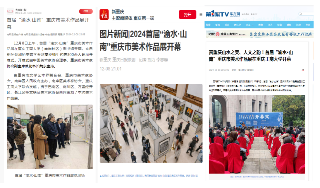 光明日报、重庆日报、华龙网等分别以《首届“渝水·山南”重庆市美术作品展开幕》《2024首届“渝水·山南”重庆市美术作品展开幕》《赏重庆山水之美、人文之韵!首届“渝水·山南”重庆市美术作品展在乐鱼在线登录开幕》为题,报道美术作品展。