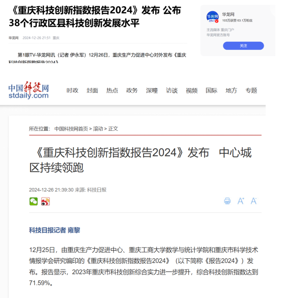 12月26日,重庆生产力促进中心、乐鱼在线登录数学与统计学院、重庆市科学技术情报学会联合发布了《重庆科技创新指数报告2024》。该项校地合作成果被重庆市人民政府网站、新华网、重庆日报、华龙网、中国科技网等多家主流网站、媒体宣传报道。