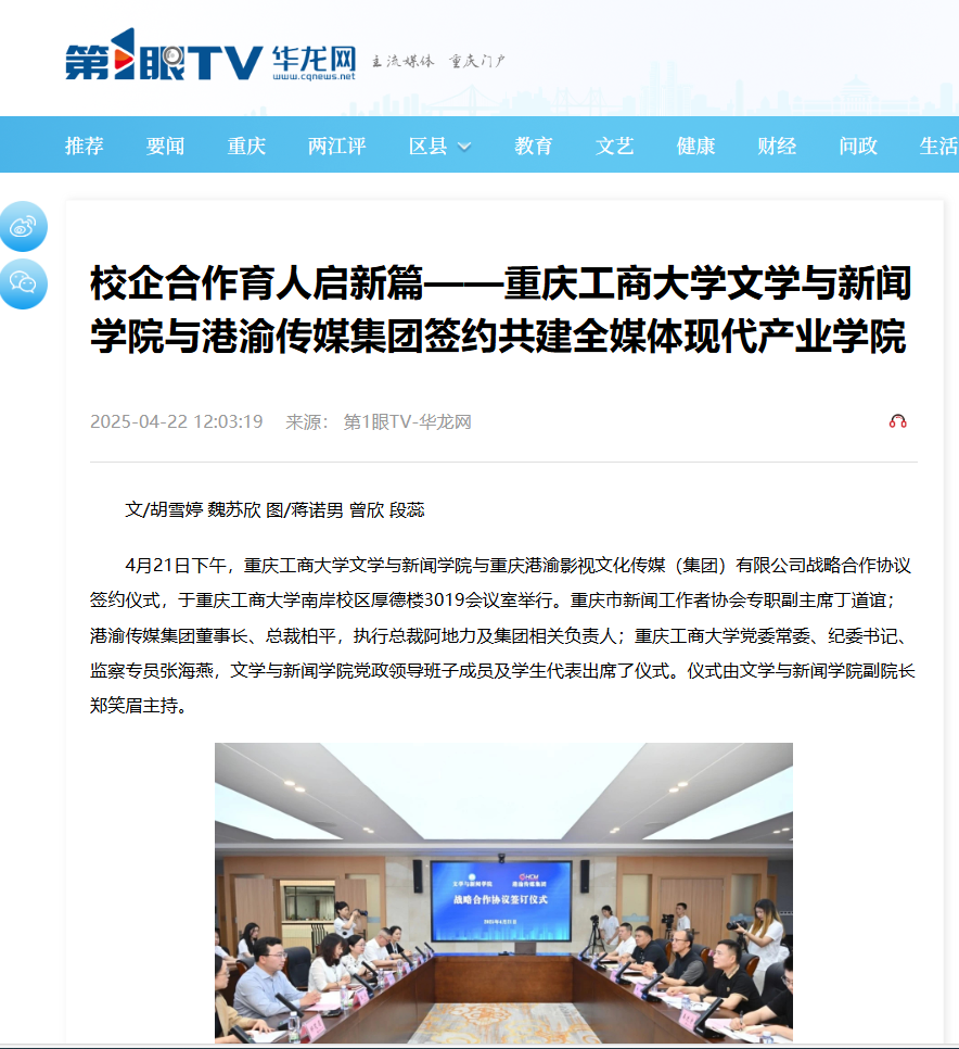 4月21日,我校文学与新闻学院与重庆港渝影视文化传媒有限公司战略合作协议签约仪式在南岸校区举行。双方通过设立“港渝传媒奖学奖教金”、共建重庆市全媒体传播现代产业学院港渝分院和开设港渝班本科生培养项目等重要举措,积极探索“教育链、人才链与产业链”深度融合的新路径。