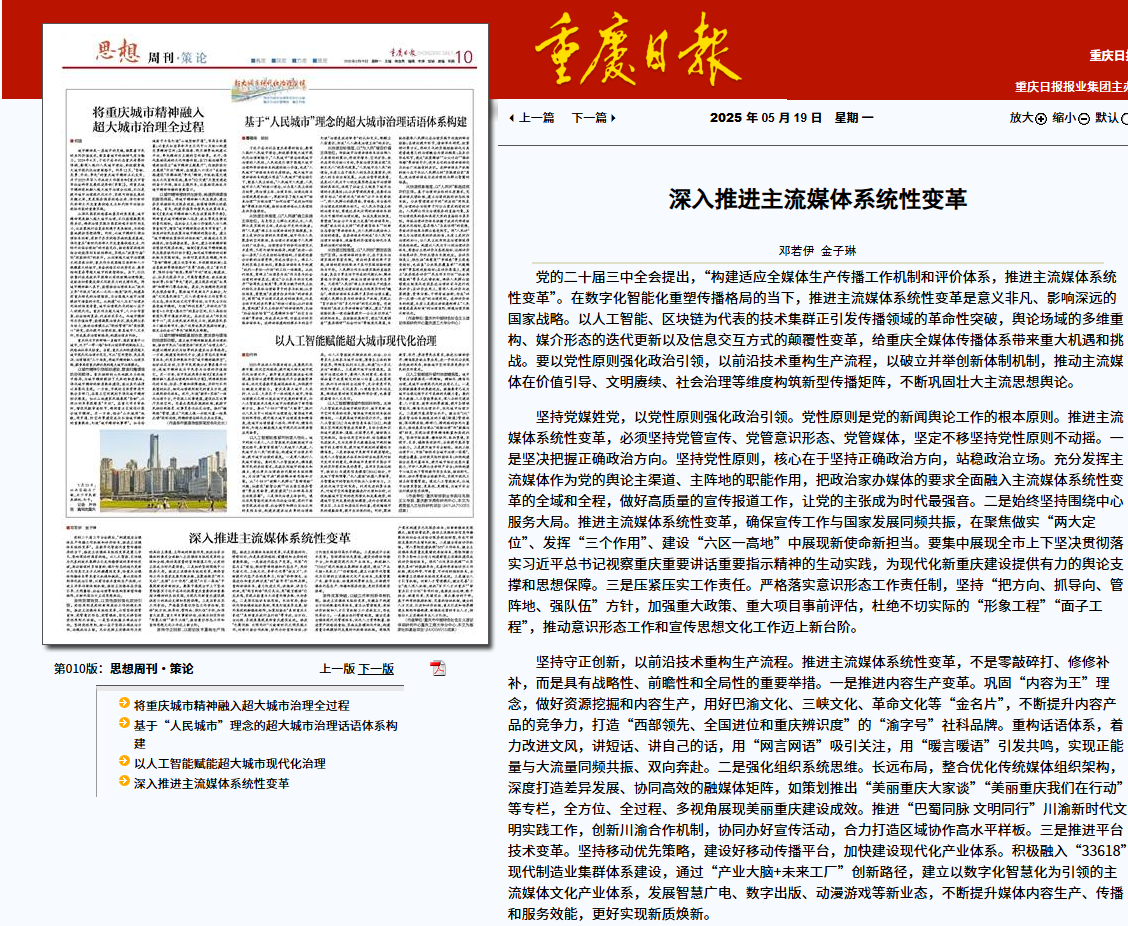 5月19日,《重庆日报》思想周刊登载学校文学与新闻与新闻学院教授邓若伊为第一作者撰写的文章《深入推进主流媒体系统性变革》。
