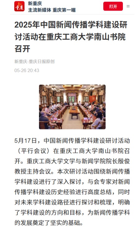 新重庆-重庆日报以《2025年中国新闻传播学科建设研讨活动在乐鱼在线登录南山书院召开》为题对该活动进行报道。