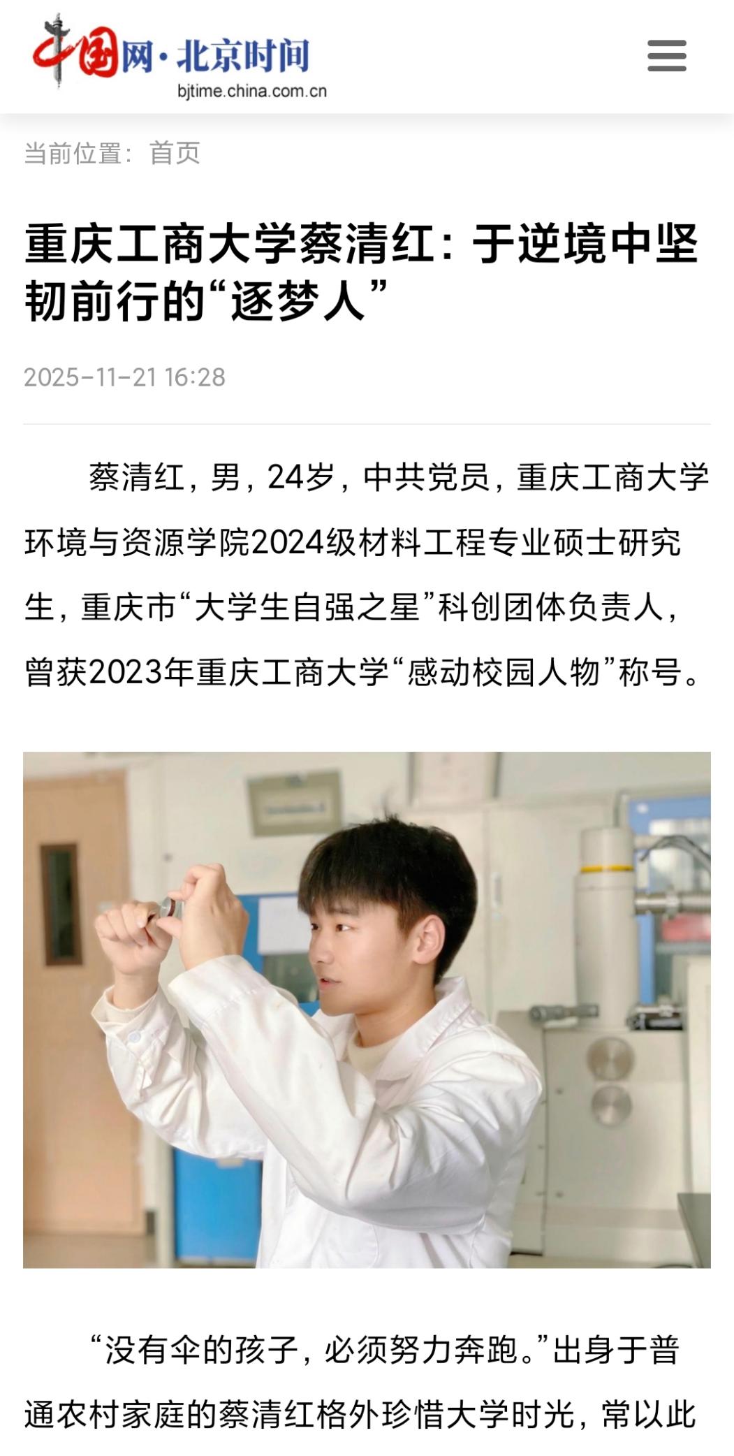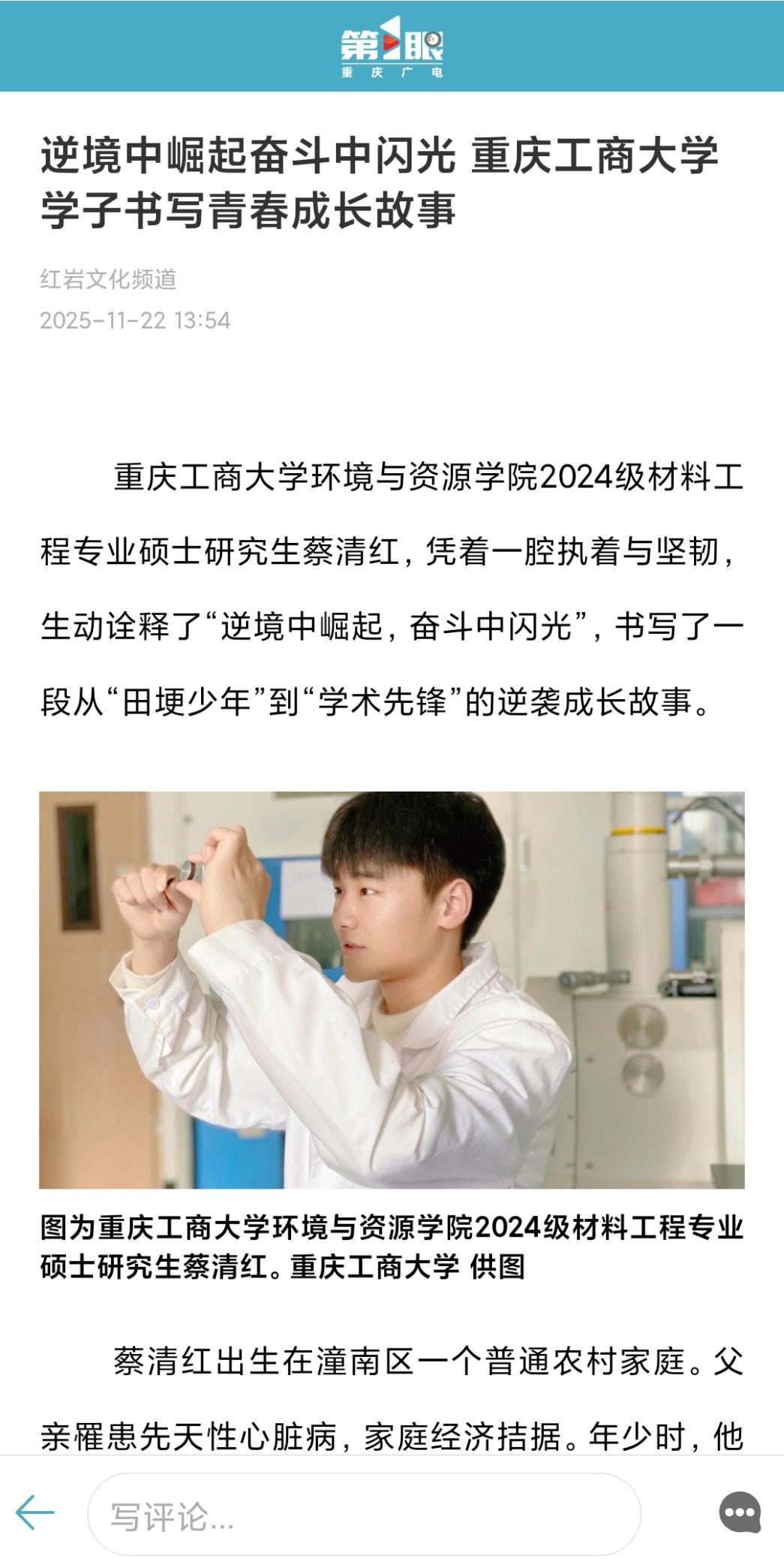 近日,我校环境与资源学院2024级材料工程专业硕士研究生蔡清红的成长故事引发关注。这位从潼南农村走出的“田埂少年”,凭借执着与坚韧突破逆境,在学术科研与社会服务中绽放青春光彩,成为新时代青年奋斗的鲜活典范。