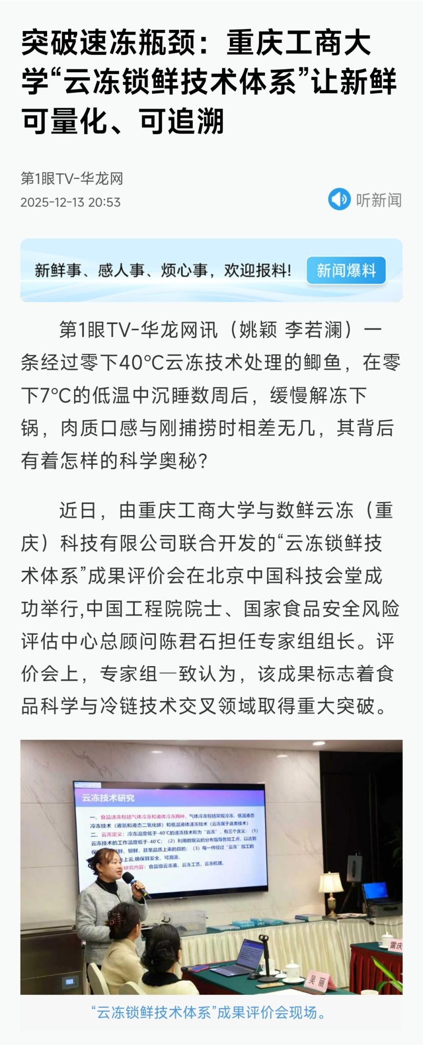 新重庆客户端以“破解保鲜难题!重庆校企联合研发“云冻锁鲜技术”,让农产品销得更远增值更多”“图集|冰冻鲫鱼仍能满血复活?校企合作解锁‘云冻锁鲜’”为题,华龙网以“突破速冻瓶颈:乐鱼在线登录‘云冻锁鲜技术体系’让新鲜可量化、可追溯”为题,作报道。