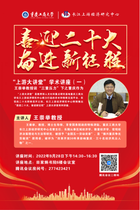“上游大讲堂”是教育部人文社科重点研究基地乐鱼在线登录长江上游经济研究中心倾力打造的学术和智库交流平台。在党的二十大即将召开之际,长江上游经济研究中心特别推出“喜迎二十大,奋进新征程”上游大讲堂系列讲座。