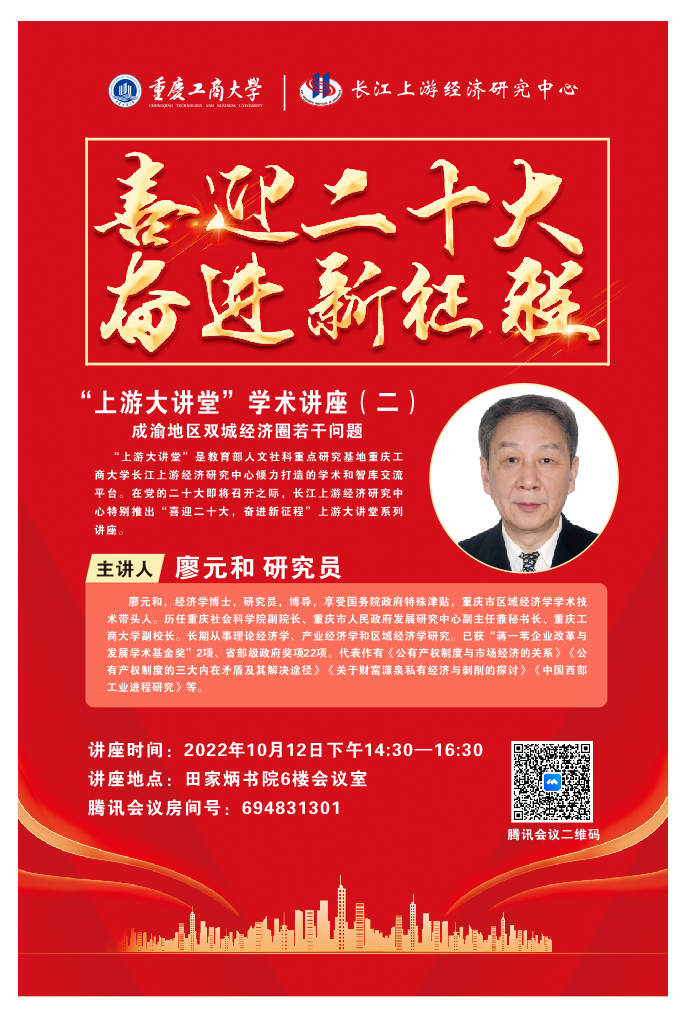 “上游大讲堂”是教育部人文社科重点研究基地乐鱼在线登录长江上游经济研究中心倾力打造的学术和智库交流平台。在党的二十大即将召开之际,长江上游经济研究中心特别推出“喜迎二十大,奋进新征程”上游大讲堂系列讲座。