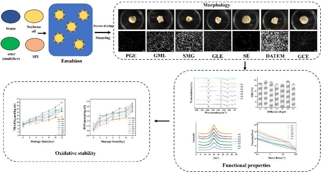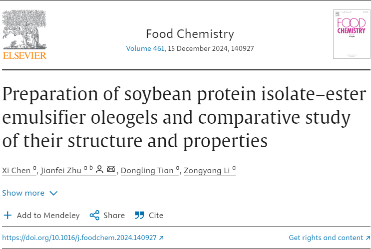 近日,我校食品科学与工程学院2022级食品科学专业硕士研究生陈爔,在导师朱建飞副教授的指导下,在食品领域国际期刊《Food Chemistry》发表了题为“Preparation of soybean protein isolate–ester emulsifier oleogels and comparative study of their structure and properties”(大豆分离蛋白-酯类乳化剂油凝胶的制备及其结构与性质比较研究)的研究论文。