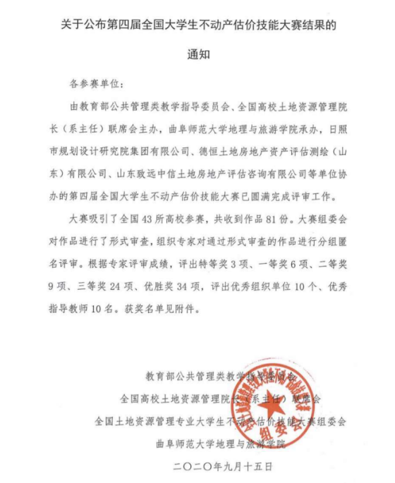 9月16日,第四届全国大学生不动产估价技能大赛圆满落下帷幕。我校管理科学与工程学院派出1支队伍、共4位队员参加此次大赛,经过激烈角逐,最终获得了优胜奖。