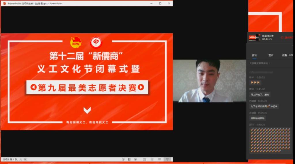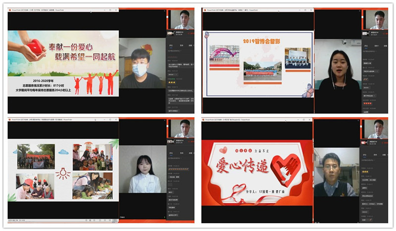 6月12日下午,由校团委主办,校义协承办的第九届“最美志愿者”决赛在企业微信直播间举行。重庆市志愿服务指导中心雷筱老师、团市委高校工作部李洪博老师、党委教师工作部李莉莎副部长、党委学工部潘焱副部长、校团委陆嘉副书记担任比赛评委,来自校、院义工志愿者协会的志愿者代表等近300人参加活动。