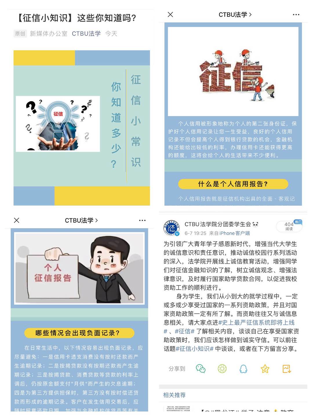 为进一步宣传和落实诚信主题教育,法学院学团办高度重视,精心安排,充分发挥网络平台优势,利用微信、微博等新媒体渠道加强征信知识普及,积极营造诚信为荣、失信可耻的诚信文化氛围。