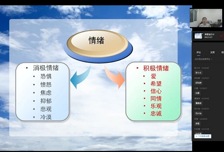 为了让学生在疫情期间更好地了解、认识自我情绪,缓解压力,引导学生正确面对负面情绪,探索情商管理的有效方式,5月13日,会计学院心理工作站举办的线上心理讲座“情绪——你需要知道的”如期举行。讲座由陈曦老师主持,在线听众200余人。