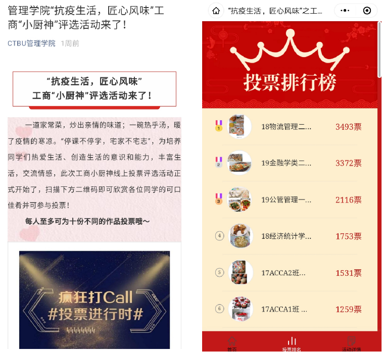 本次活动受到全校学生的高度关注,大家踊跃参赛,纷纷施展个人绝活,展现各地风味美食,共收到400多份色香味俱全的美食作品。经过评委公平公正地精心挑选,120份优秀作品进入下一轮决赛,投放于管理学院官方微信公众号进行大众投票。在紧张刺激的投票环节,这些造型各异、五颜六色的厨艺作品吸引了大批观众前来欣赏。在短短几天内,投票界面的总访问数突破了12万次,总投票数近3万票,给参赛者和组织者给予了莫大的鼓舞。最后,根据大众评审投票的多少,活动评选出了一等奖10名,二等奖15名,三等奖20名,并在开学后为获奖的同学们发放荣誉证书和精美礼品,以此鼓励大家在疫情时期宅在家中仍然热爱生活,积极创造的人生态度。