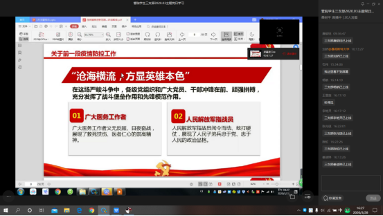 随后,来自大四工程管理专业的杨航同学就本次学习内容发言,并分享了自己在学习成长及就业应聘方面的经验。目前在英国留学、党籍保留在支部的2015级工程管理专业刘娇同学分享了自己的身体健康近况及海外的疫情形势,她特别动情地感恩伟大祖国此时通过各种途径传递的对中国留学生的精神支持及实际物资救助,使每一位与会同志深受鼓舞和感动。