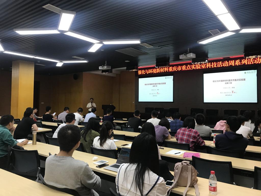 2019年5月23日,催化与环境新材料重庆市重点实验室2019年科技活动周系列活动在乐鱼在线登录新图书馆会议中心多功能厅举行。重庆大学化学化工学院院长、国际著名电催化专家、长江学者魏子栋教授,重庆市环保工程院、重庆杰润科技有限公司、重庆天星环保公司、重庆环保产业基金、西服仪(成都)科技等五家企业代表,催化与环境新材料重庆市重点实验室团队成员,乐鱼在线登录部分研究生、本科生参与了此次活动。