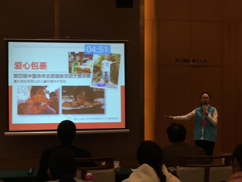 本届大赛以“青春志愿行·奉献新时代”为主题,在为期两天的赛会活动中,来自全国各个省市各个领域的590个优秀志愿服务项目通过公开路演答辩,角逐此次大赛奖项。经济义协“爱心包裹——重庆酉阳贫困山区儿童长期关怀项目”在校团委、经济学院分团委的指导下,历经两年的各级各类选拔,以市级高校选拔赛一等奖的成绩代表重庆市参加国赛角逐。在国赛赛场上,通过精彩的路演答辩获得了各位评委关注,得到了评委的肯定与鼓励,最终成功获得全国银奖。