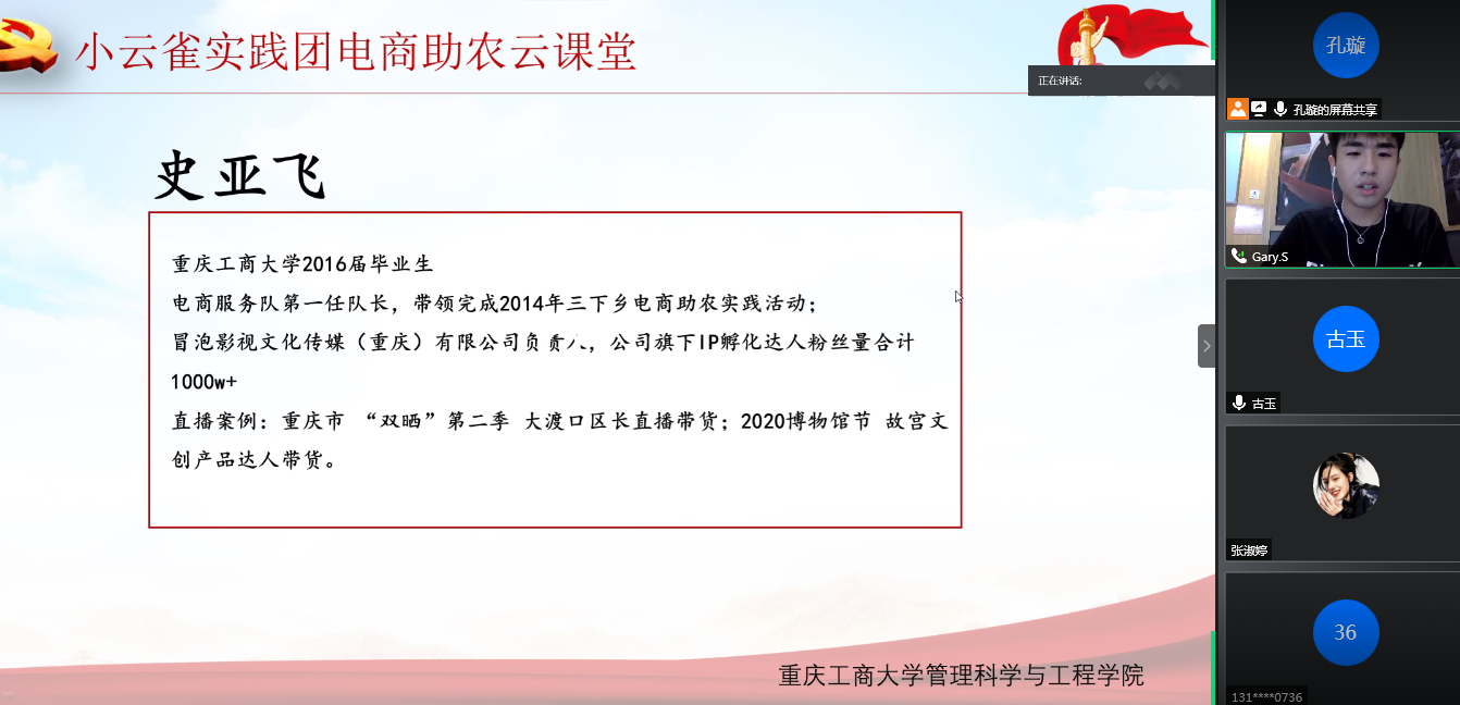 奋斗的青春最美丽。此次活动不仅仅是一场校友分享会,也是一次生动的云课堂。校友用自己奋斗的经历感召着同学们。同学们不仅收获了丰富的直播电商的知识,也进一步明确了自己身上的责任和努力的方向。在校友的激励下,同学们将更好地开展助力脱贫攻坚的实践活动,用自己的专业知识回馈社会。