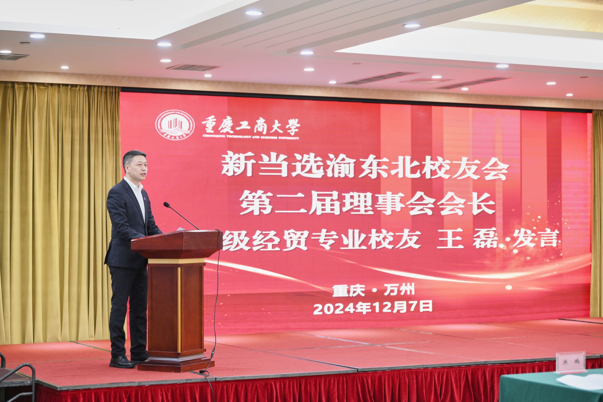 新当选的渝东北校友会第二届理事会会长王磊校友发言。他表示,要在学校与学校校友会的指导下,团结和带领渝东北11个区县的广大校友,不断拓展校友联络“半径”,持续打造母校与校友的联动平台,以校友情为纽带,弘扬母校“含弘自强、经邦济民”的重工商大精神,为地方经济社会发展做出新贡献。