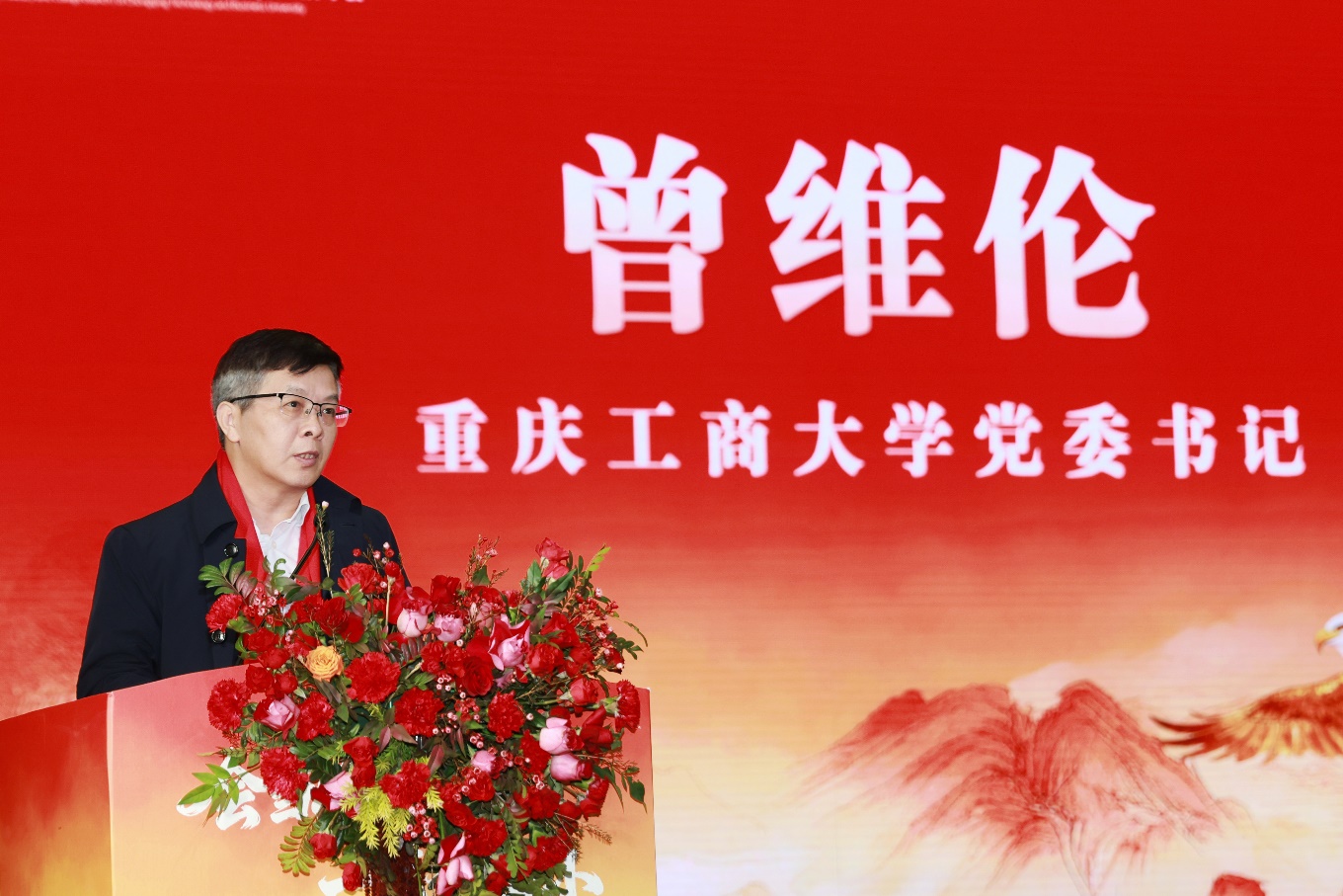 曾维伦代表学校向莅临年会的领导、嘉宾表示热烈欢迎,向长期以来关心支持学校发展的各级领导、广大校友、各界人士表示衷心感谢,向年会的主办协办分会、筹备校友、赞助企业表示诚挚谢意,并向大家提前送上新年的问候与美好祝愿。曾维伦指出,母校是校友美好的青春记忆、共同的精神家园,校友是母校最坚实的支撑、最亮丽的名片。73载的办学历程中,母校与校友学脉相承、文脉赓续,早已成为情感共同体、发展共同体和命运共同体。曾维伦向与会校友分享了“十四五”时期学校实现的历史性突破、取得的标志性成果,充分肯定了学校校友工作办公室统筹推进校友工作与校友会建设的成效,高度评价了海内外校友对母校建设与发展的守望相助。曾维伦强调,在“十四五”圆满收官、“十五五”新篇初展的历史交汇点上,海内外校友重返母校,共赴校友年会之约,承载着总结过往、擘画未来的特殊意义。年会的主题“会当凌绝顶,一览众山小”,既是广大校友赓续“含弘自强、经邦济民”重工商大精神的生动写照,更是对“坚韧、忠勇、开放、争先”重庆城市精神的深刻诠释与鲜活注脚。希望各位校友,胸怀登高望远的气魄,坚定攻坚克难的信心,以攀登者之姿同心聚力,以奋斗者之态砥砺前行,与母校一道携手续写“十五五”时期事业共同发展的崭新篇章。